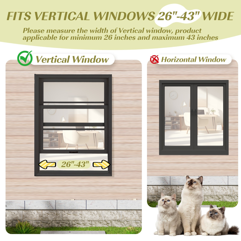 - Cat Window Box Application: Acrylic cat window catio is suitable for vertical windows 26" to 43" wide, not round or horizontal windows.The catio window box is equipped with retractable side panels to fit the windows and can be painted to match your home