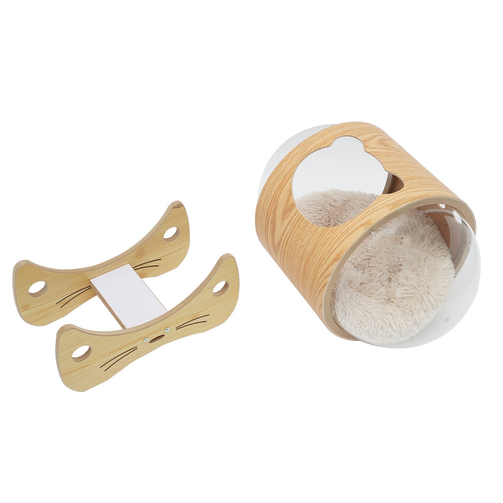 Specification Color:Wood+Clear Shape: Capsule-shaped Material: Wood, Acrylic, andCashmere Finish Type: Veneer Covering Target Species: Cat Wash Style: Hand Wash Specific Uses for Product: Indoor Assembly Required: Yes Mount Type: Floor Standing Overall Size: 60(L)*48(H)cm/23.6*18.9 inch Bearing Capacity: About 8.5kg/18.74lbs Diameter of Capsule: 35cm/13.8inch Diameter of Opening: 20cm/7.9inch Size of Base: 23.5(L)*42(W)cm/9.3*16.5inch Plate Thickness:0.5cm/0.2inch Cushion Thickness: 10cm/3.94inch Cushion Diameter: 40cm/15.75inch